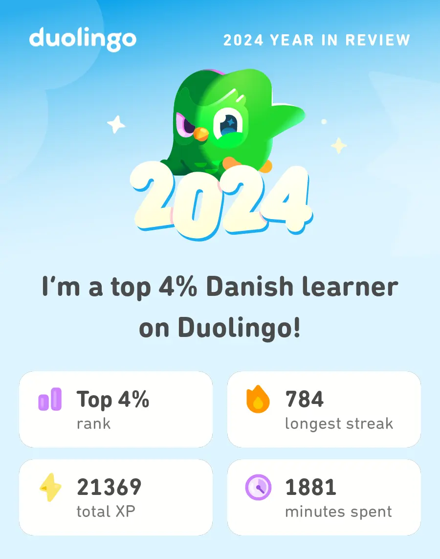 Let’s kick things off with a huge personal victory: I officially passed Prøve i Dansk 3 (official website only in Danish). This marks the culmination of a two-year journey of Danish language studies at language school. But the story goes even further back. My first tentative steps into the world of Danish began way back in March 2017, when I first started using Duolingo. While my learning was on and off for a while, I finally decided to commit more seriously around the same time I started joining Danish language classes in August 2022, and my consistent efforts on Duolingo significantly contributed to leading me to where I am today. Fun fact: Duolingo decided to present me with my “Year in Review” recap on the exact same day I passed the exam! Talk about perfect timing… As of December 31st, I had a whopping 814-day streak on the app 🔥. It’s a testament to consistency and a reminder that even small daily efforts can lead to great results 💪.